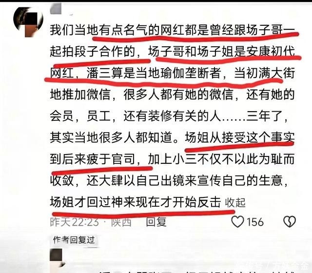 事情要从2021年说起。那时候场子姐和老公靠着自媒体干得风生水起,在安康开了好几家店,算是本地网红夫妻。他们认识潘某是因为合作拍广告,潘某自称是离异带娃的单身妈妈,结果这人后来成了出轨的第三者。场子姐说无意间在老公车里发现了潘某的流产资料,才知道对方早把自己当空气了。